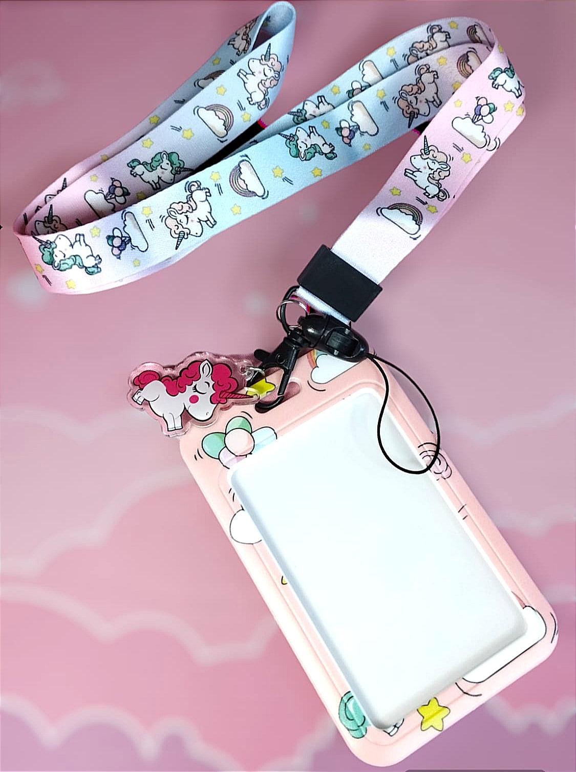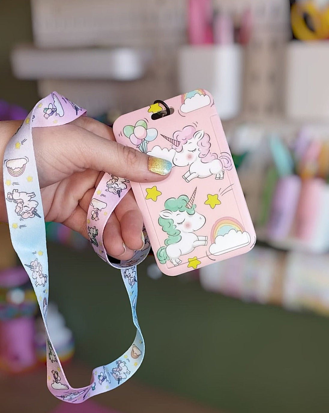 Porte carte/badge Licorne et son cordon tour de cou de taille 45x2cm. Peut être utilisé pour les cartes de car/bus, cantine, carte d'identité, d'association,...